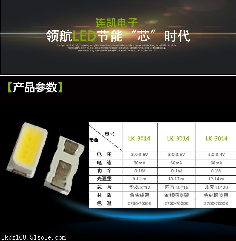 (2)3014的厚度仅为0.8mm,可以化解3528侧面的光斑疑问,但3014的发光面积小,出光率仅为85-88%左右,可以提高整个灯的亮度。
